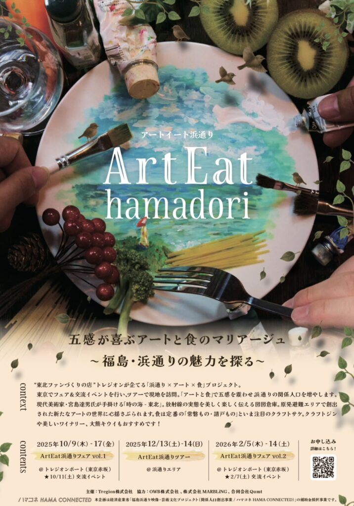 《Art Eat 浜通り》とは、東北のファンづくりの店・トレジオンが企てる「浜通り×アート×食」のプロジェクトです。東京赤坂のトレジオンポートでフェア&交流イベントを開催し、「アートと食」で五感を震わせ、福島・浜通りの魅力を知っていただくきっかけの場をご提供いたします!