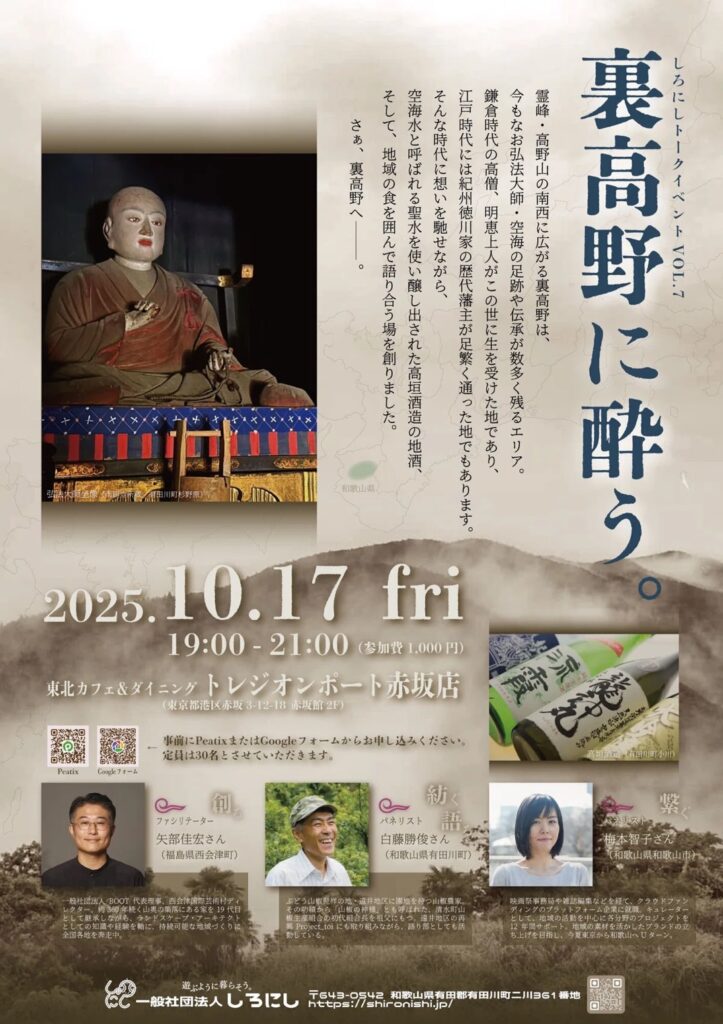 10/17(金)19時から、和歌山県有田川町に拠点を構え、「地域の人事部」として地域維持レスキューや遊び暮らし体験などをプロデュースする一般社団法人「しろにし」が主催するトークイベントの第7弾『裏高野に酔う』を、この度トレジオンポートで開催します!ファシリテーターには、裏高野エリアとも縁の深い福島県西会津町で“西会津国際芸術村”ディレクターを務める矢部佳宏さんをお招きします!